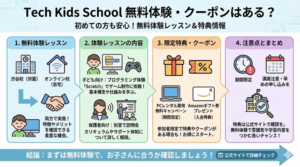 ただし、これらの特典は期間限定である場合が多いため、公式サイトや体験レッスンの案内を確認しておくことが重要です。また、満席になることもあるため、早めの申し込みをおすすめします。無料体験は、Tech Kids Schoolの雰囲気をつかみ、実際の学習内容を体験する良いチャンスです。