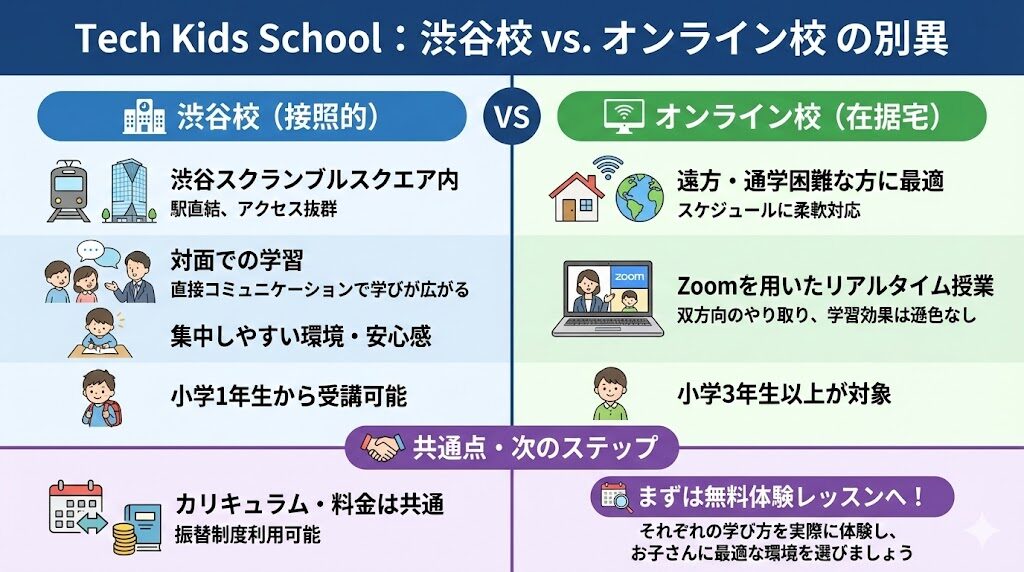 Tech Kids Schoolには、対面で学べる「渋谷校」と自宅から受講できる「オンライン校」の2つの学習形式があります。それぞれの特徴やメリットを知ることで、お子さんに最適な受講形態を選ぶことができます。