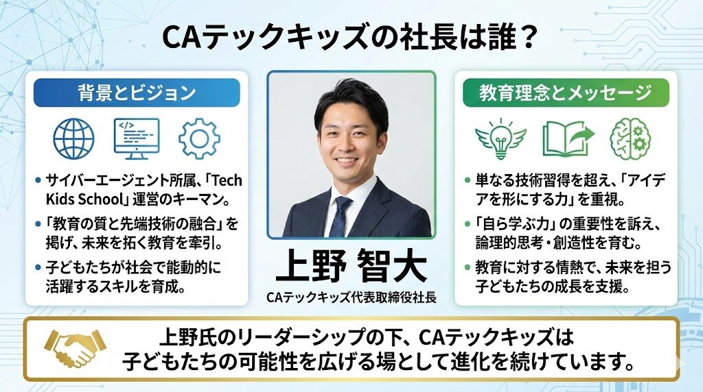 CAテックキッズの社長は、「上野 智大(うえの ともひろ)」氏です。上野氏は、IT業界のリーディングカンパニーであるサイバーエージェントに所属し、同社が提供する子ども向けプログラミング教育サービス「Tech Kids School」の運営を担う重要な人物として活躍しています。彼のリーダーシップの下、CAテックキッズは子どもたちに未来を切り拓くためのプログラミング教育を提供する場として成長を遂げてきました。