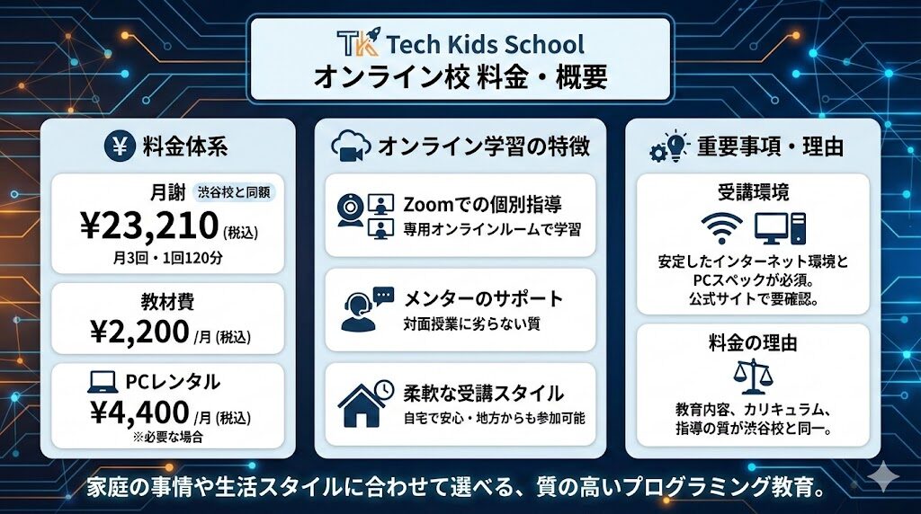 Tech Kids Schoolオンライン校の料金は、渋谷校と同じで月謝23,210円(税込)です。この料金により、月3回(1回120分)の授業を受講できます。オンライン校でも、教材費として毎月2,200円(税込)が必要です。また、家庭でパソコンを準備する必要がありますが、これが難しい場合は別途月額4,400円(税込)でパソコンレンタルの利用が可能です。