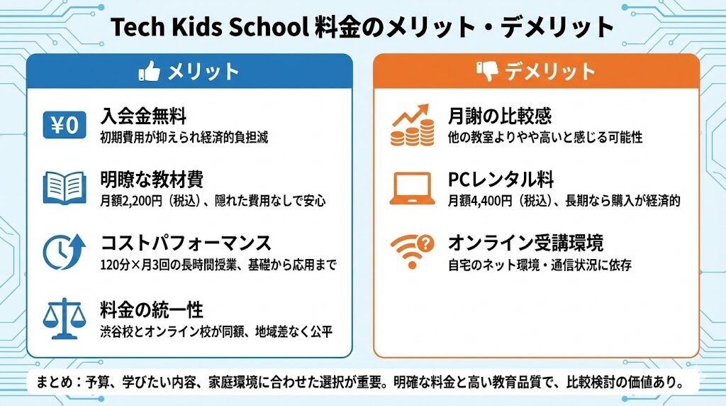 Tech Kids Schoolの料金体系には、メリットとデメリットの両面があります。まず、メリットとして挙げられるのは、入会金が無料である点です。この点は、初期費用が高額になりがちな他のスクールと比較して、経済的負担が軽減される大きなポイントです。また、教材費も毎月2,200円と明瞭に設定されており、隠れた費用が発生しない点も安心感があります。