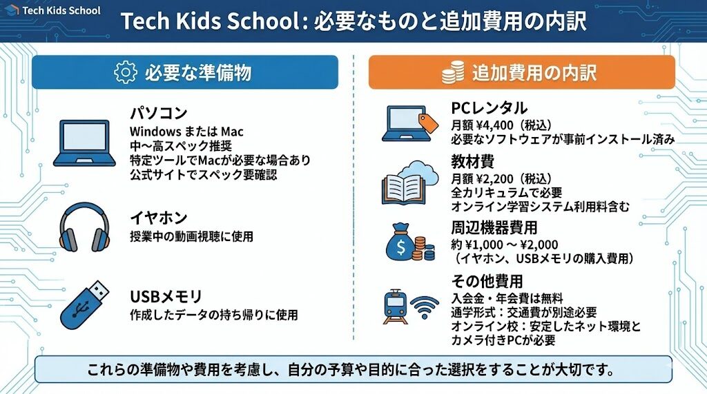 Tech Kids School(テックキッズスクール)で学習を始めるにあたり、必要な準備物と追加費用の内訳を理解しておくことは重要です。授業をスムーズに進めるためには、以下のものが必要です。