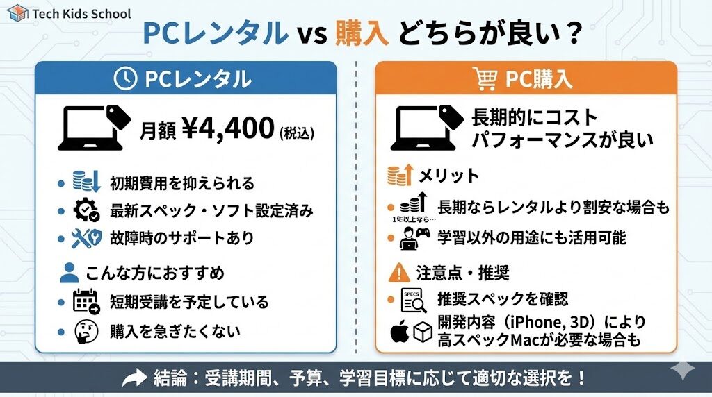 Tech Kids Schoolで学習を始める際に、パソコンのレンタルを利用するか購入するかは、受講期間や予算に大きく影響します。それぞれの選択肢にはメリットとデメリットがありますので、具体的に比較してみましょう。