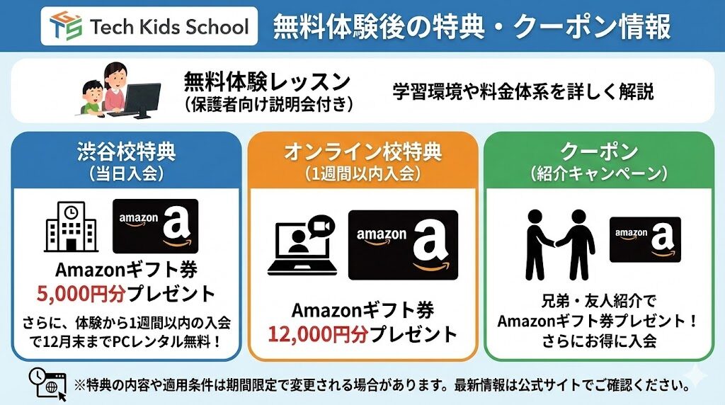 また、無料体験レッスンに参加した方限定で、特典やクーポンが用意されている場合もあります。例えば、一定期間のPCレンタル費用が無料になるキャンペーンや、入会時にAmazonギフト券がもらえる特典が提供されることがあります。これにより、よりお得にプログラミング学習をスタートすることが可能です。