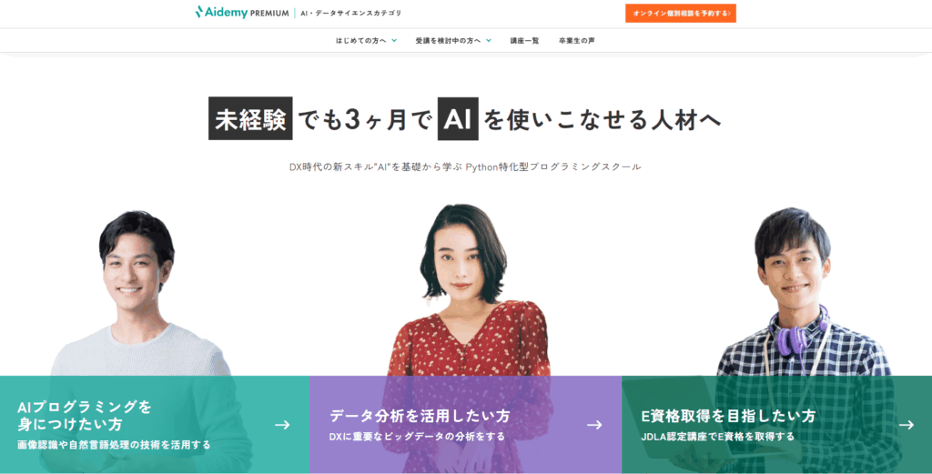 | おすすめ ポイント | 未経験から仕事で 使えるスキルが しっかり身に付く | Pythonを活用した 生成AIの開発に 特化したプログラム | 実務で使えるAI、 Webスキルを幅広く 習得可能 |