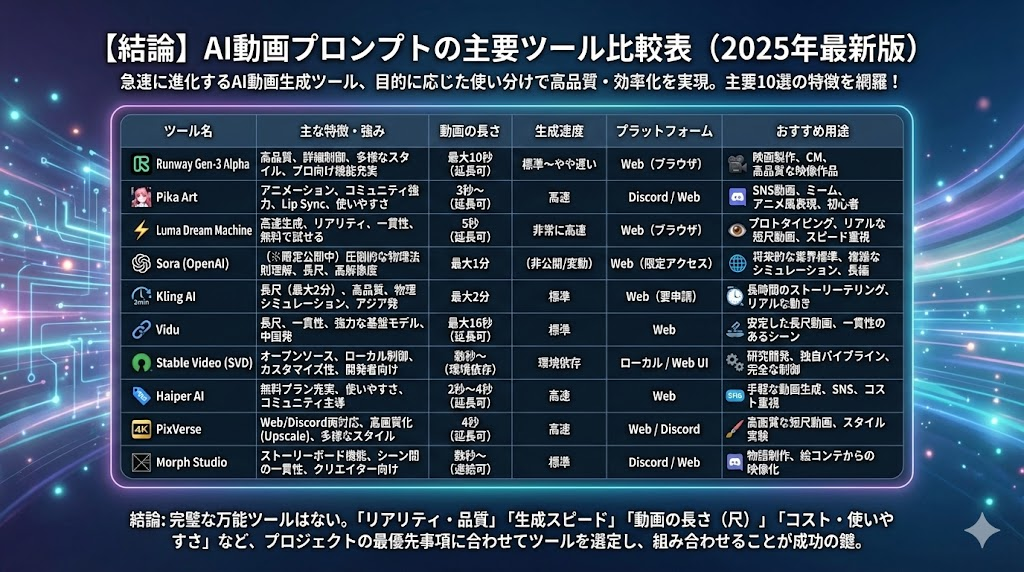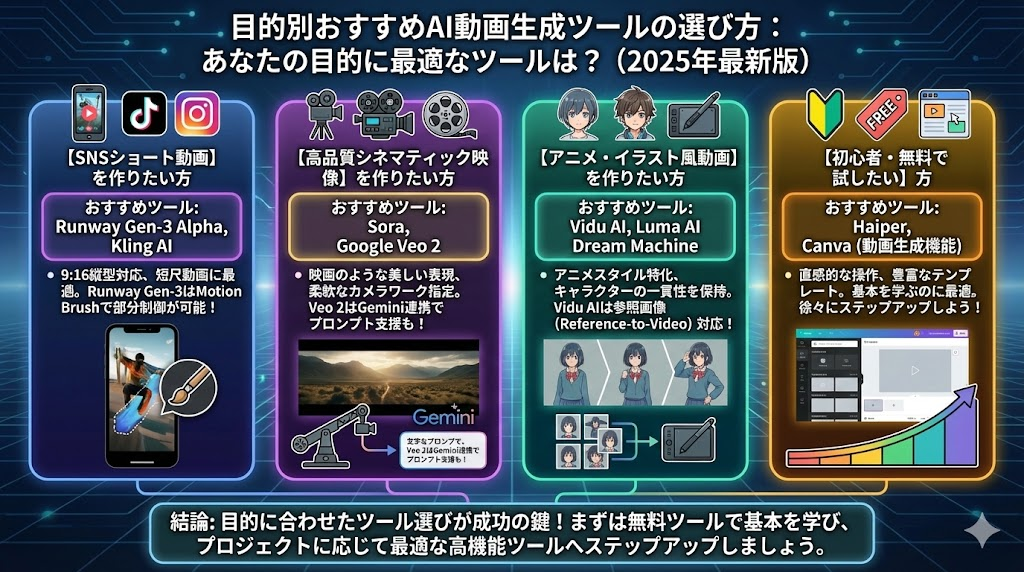この比較表を見ると、各ツールにはそれぞれ異なる強みがあることがお分かりいただけるかと思います。例えば、映画のようなシネマティックな映像を作りたい場合はSoraやVeo 2が適していますし、SNS向けのショート動画を手軽に作りたい場合はRunway Gen-3やKling AIがおすすめです。