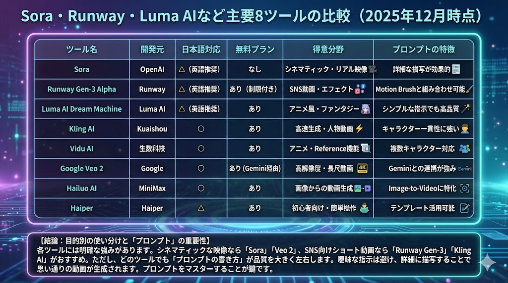 Sora・Runway・Luma AIなど主要8ツールの比較