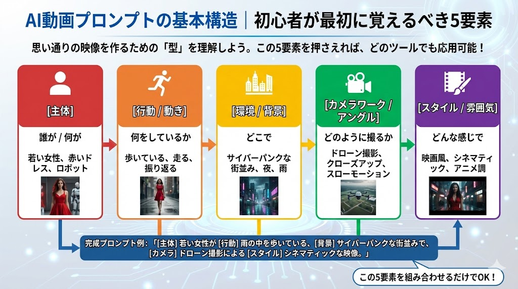 AI動画プロンプトの基本構造|初心者が最初に覚えるべき5要素