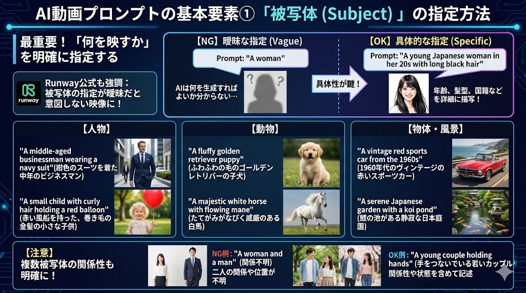 Runway公式ドキュメントでも解説されているように、プロンプトの最も重要な要素は「被写体」、つまり「何を映すか」を明確に指定することです。被写体の指定が曖昧だと、AIは何を生成すればよいか分からず、意図しない映像が出力されてしまいます。