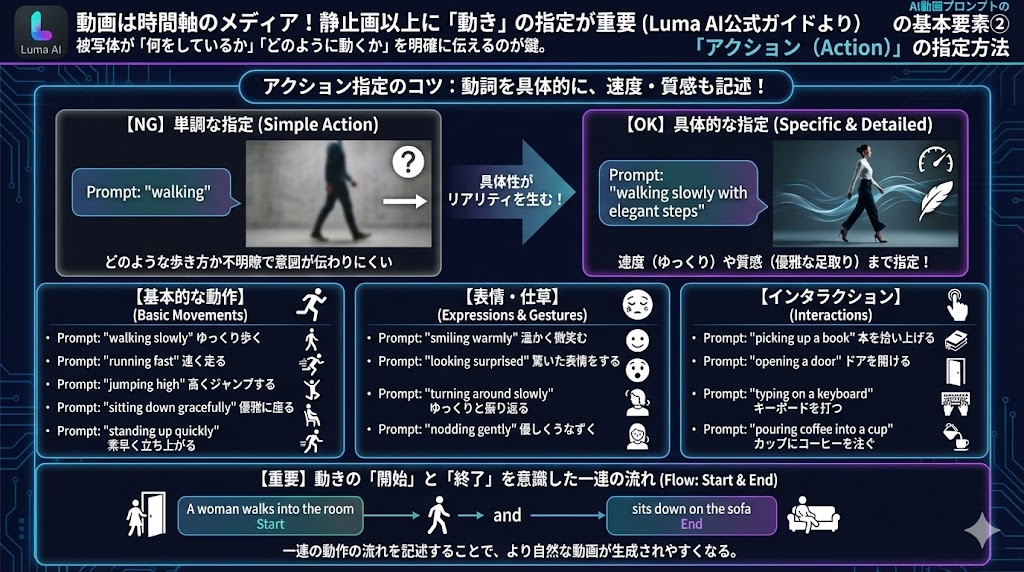 Luma AI公式ガイドによると、動画生成において「動き」の指定は静止画生成以上に重要な要素です。動画は静止画と異なり、時間軸を持つメディアですので、被写体が「何をしているか」「どのように動くか」を明確に伝える必要があります。