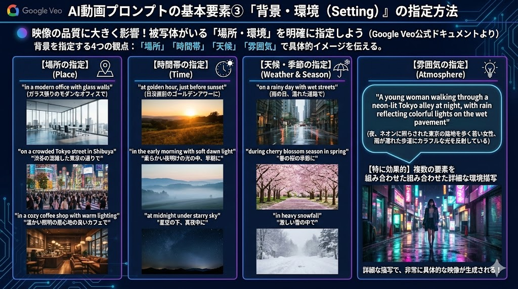 Google Veo公式ドキュメントでは、背景や環境の設定がビデオの品質に大きく影響すると説明されています。被写体がどこにいるのか、どのような環境にいるのかを明確に指定することで、映像に説得力と奥行きが生まれます。