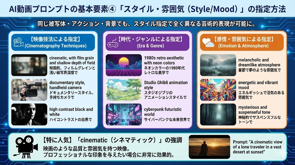 スタイルの指定には大きく分けて「映像技法」「時代・ジャンル」「感情・雰囲気」の3つのアプローチがあります。