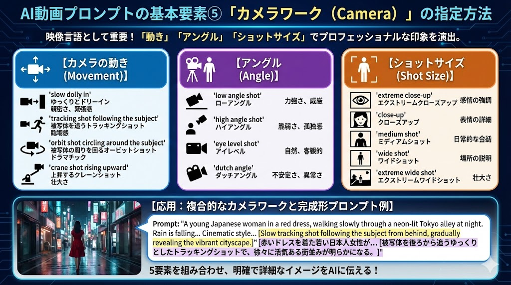 ここからは、AI動画プロンプトを構成する5つの基本要素について、具体例を交えながら詳しく解説していきます。この5要素を押さえておけば、どのツールを使う場合でも応用が効きますので、ぜひしっかりと理解していただければと思います。