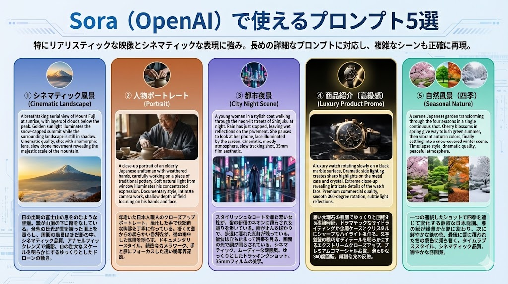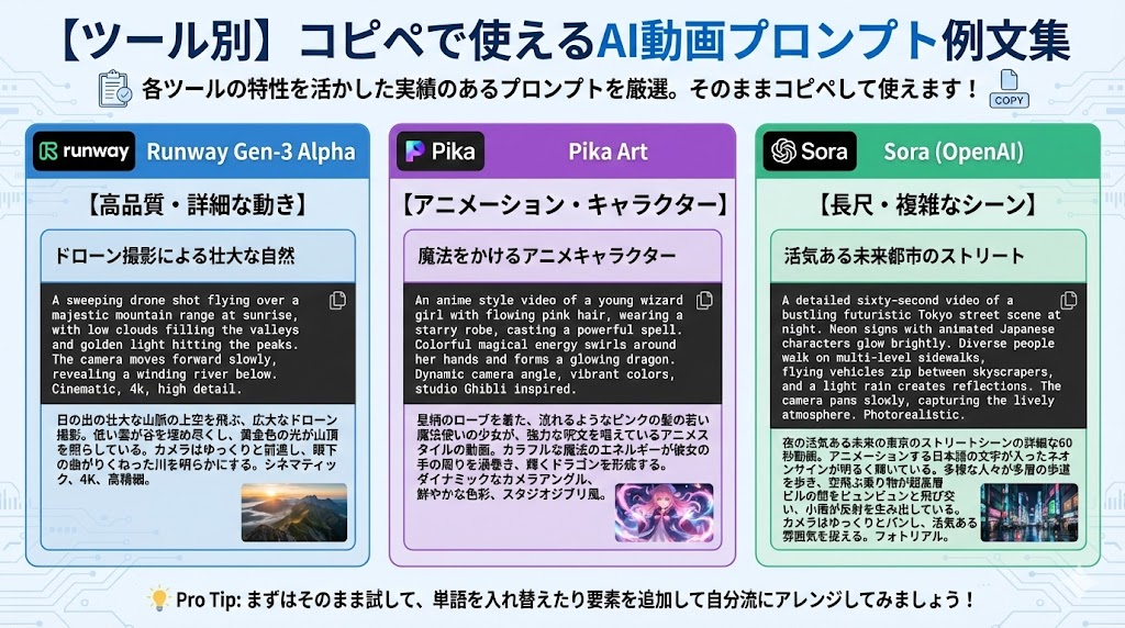 - Sora・Runway・Luma AIなど主要ツール別のプロンプト例文25選