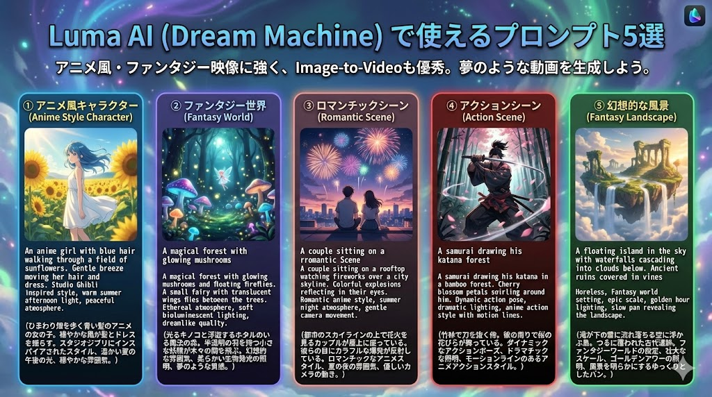 | Luma AI Dream Machine | Luma AI | △(英語推奨) | あり | アニメ風・ファンタジー | シンプルな指示でも高品質 |