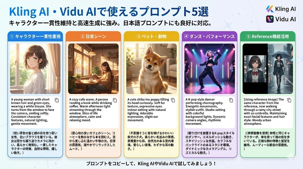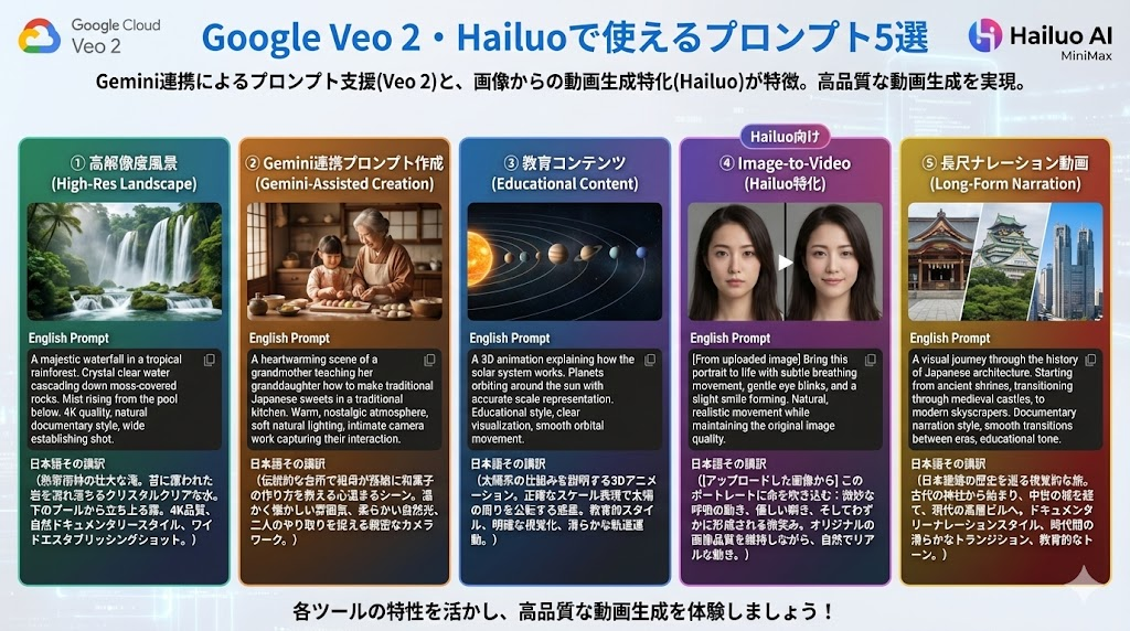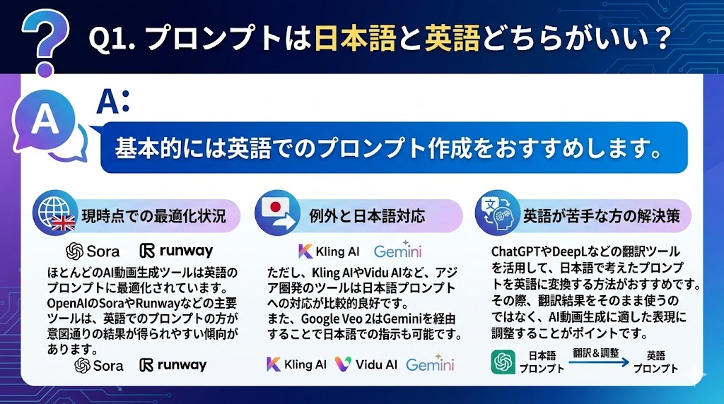 ただし、Kling AIやVidu AIなど、アジア圏発のツールは日本語プロンプトへの対応が比較的良好です。また、Google Veo 2はGeminiを経由することで日本語での指示も可能です。