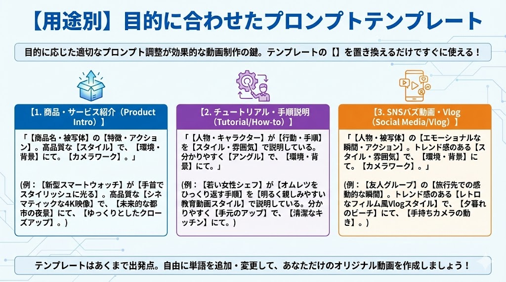 特に、自分がよく作る用途(SNS動画、商品紹介など)のテンプレートを5〜10個ストックしておくと、毎回ゼロから考える必要がなくなり、作業効率が大幅に向上します。