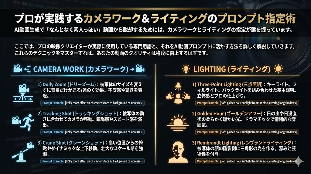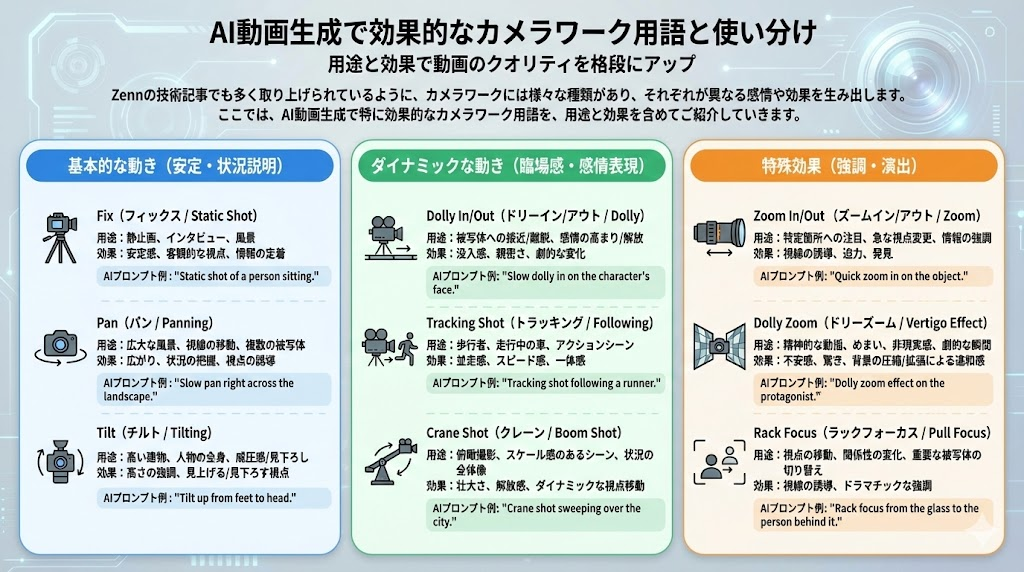 映像作品においてカメラワークは「映像言語」とも呼ばれる重要な表現手段です。AI動画生成においても、カメラワークを適切に指定することで、プロフェッショナルな印象の動画を作ることができます。