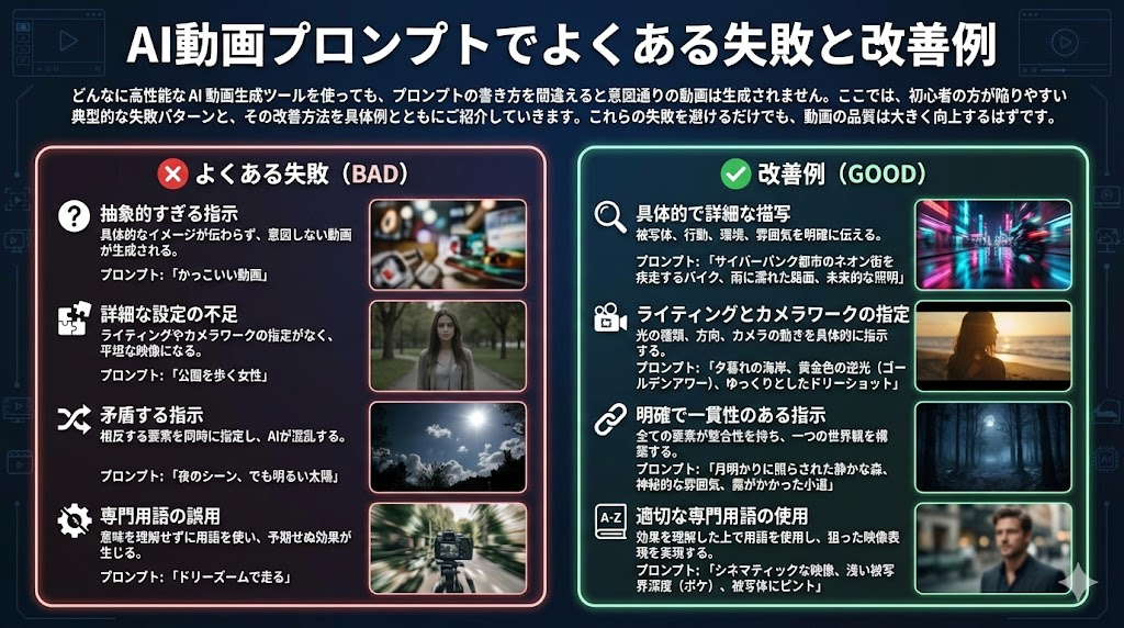 改善のポイントは、カメラワークを時間軸に沿って順序立てて記述することです。「最初は〜、次に〜、最後に〜」という形式で、一つの動画内でカメラがどのように動くかを明確に指示します。また、物理的に可能かどうかを常に意識することも重要です。