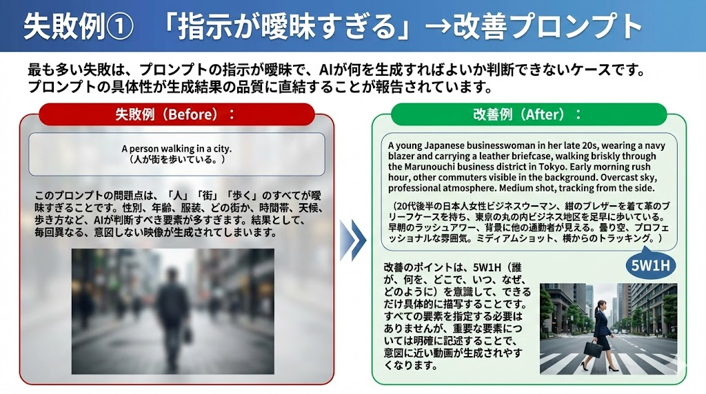 改善のポイントは、5W1H(誰が、何を、どこで、いつ、なぜ、どのように)を意識して、できるだけ具体的に描写することです。すべての要素を指定する必要はありませんが、重要な要素については明確に記述することで、意図に近い動画が生成されやすくなります。