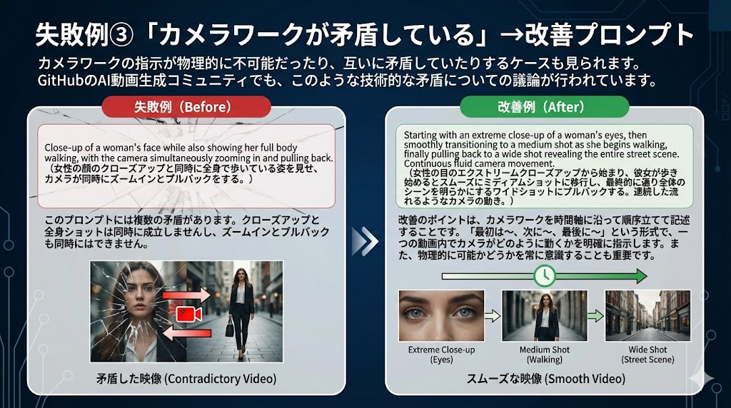 カメラワークの指示が物理的に不可能だったり、互いに矛盾していたりするケースも見られます。GitHubのAI動画生成コミュニティでも、このような技術的な矛盾についての議論が行われています。