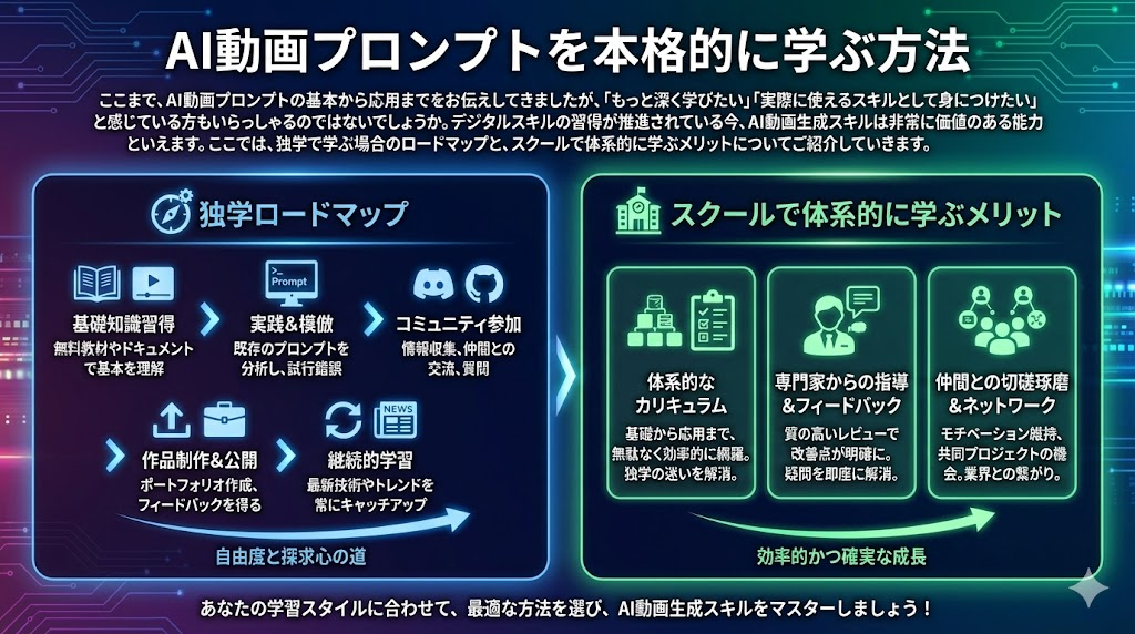ここまで、AI動画プロンプトの基本から応用までをお伝えしてきましたが、「もっと深く学びたい」「実際に使えるスキルとして身につけたい」と感じている方もいらっしゃるのではないでしょうか。デジタルスキルの習得が推進されている今、AI動画生成スキルは非常に価値のある能力といえます。