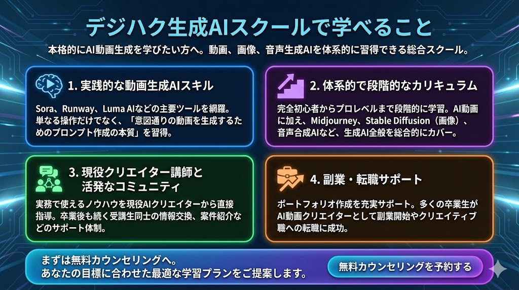 本格的にAI動画生成を学びたい方には、デジハク生成AIスクールがおすすめです。デジハクは、AI動画生成だけでなく、画像生成・音声生成も含めた生成AI全般を体系的に学べるスクールです。