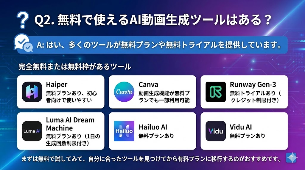 Q2. 無料で使えるAI動画生成ツールはある?