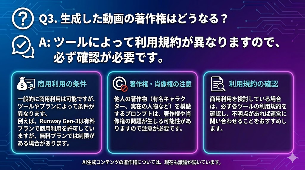 AI生成コンテンツの著作権については現在も議論が続いています。一般的に、多くのツールでは生成した動画の商用利用が認められていますが、条件はツールごとに異なります。