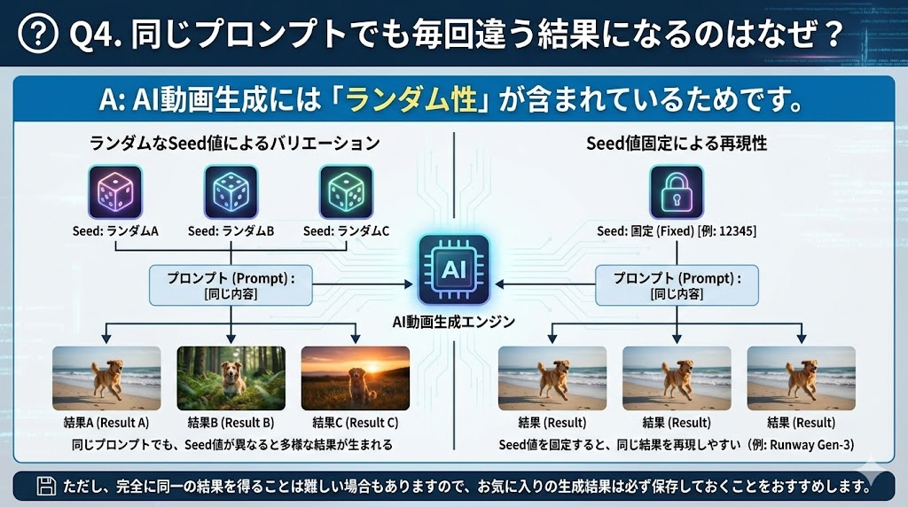 A: AI動画生成には「ランダム性」が含まれているためです。