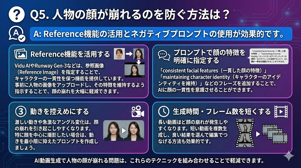AI動画生成で人物の顔が崩れる(途中で別人になる、不自然な変形が起きるなど)問題は、多くのユーザーが経験する課題です。