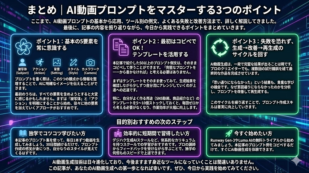 ここまで、AI動画プロンプトの基本から応用、ツール別の例文、よくある失敗と改善方法まで、詳しく解説してきました。最後に、記事の内容を振り返りながら、今日から実践できるポイントをまとめていきます。