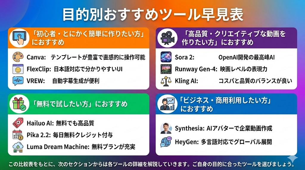 【結論】目的別AI動画作成ツールおすすめ比較表