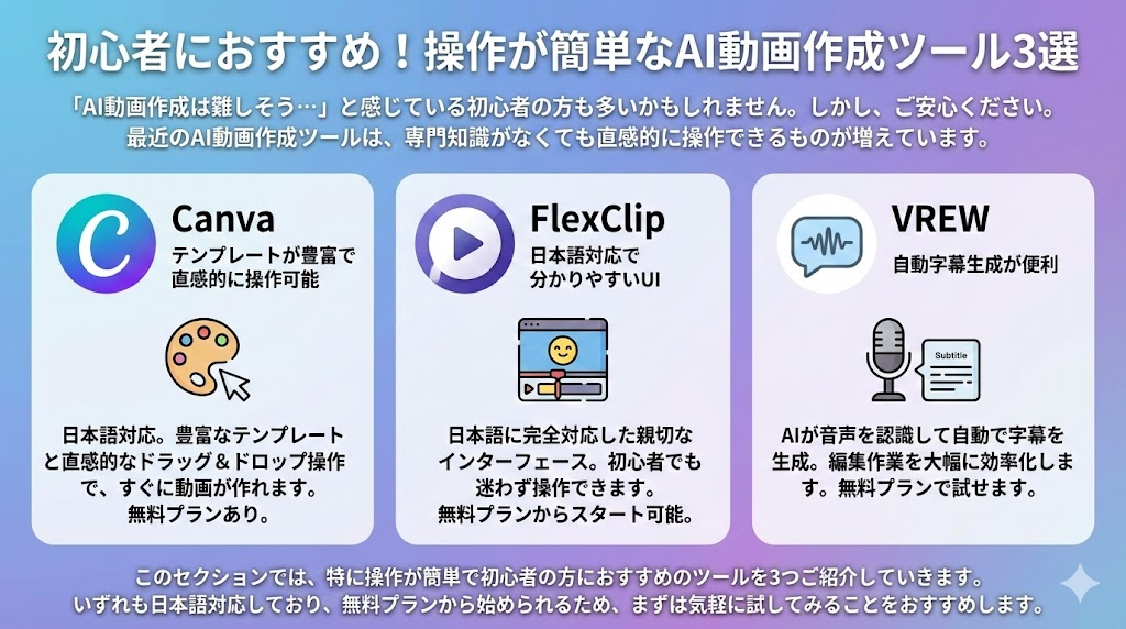 最近のAI動画作成ツールは、専門知識がなくても使えるように設計されています。特に以下のようなツールは初心者に優しい設計です。