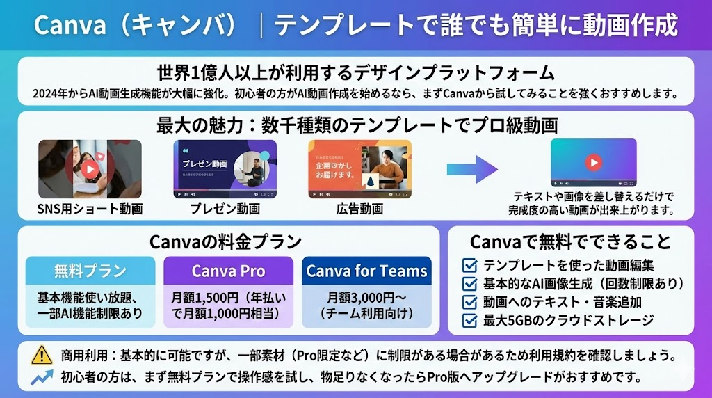 Canva公式サイトは、世界で1億人以上が利用するデザインプラットフォームで、2024年からAI動画生成機能が大幅に強化されました。初心者の方がAI動画作成を始めるなら、まずCanvaから試してみることを強くおすすめします。