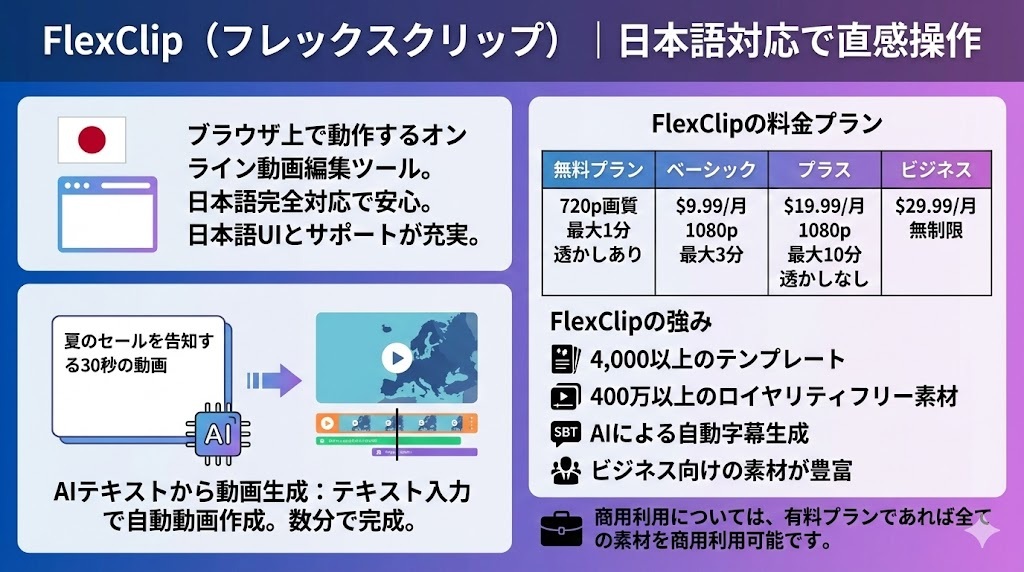 - FlexClip:日本語UIで直感的に操作