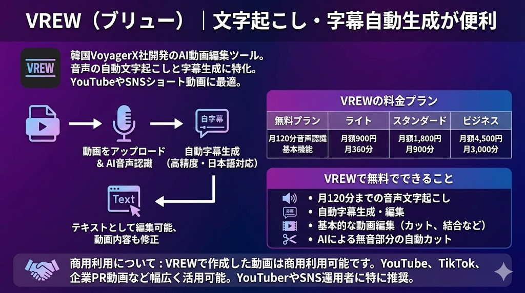 VREW公式サイトは、韓国のVoyagerX社が開発したAI動画編集ツールで、音声の自動文字起こしと字幕生成に特化しています。YouTube動画やSNSのショート動画に字幕を付けたい方には、VREWが最適な選択肢と言えるでしょう。