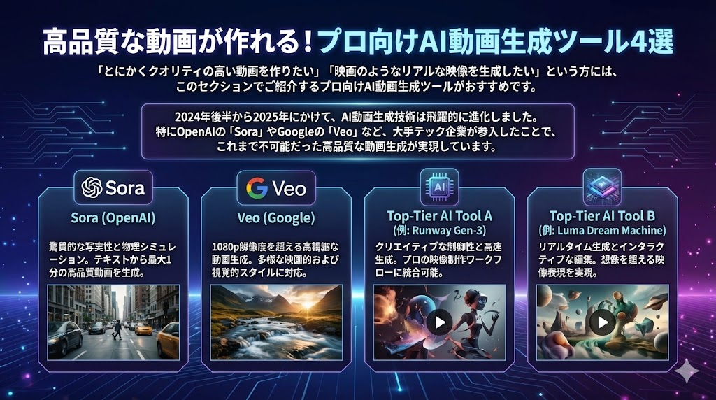2024年後半から2025年にかけて、AI動画生成技術は飛躍的に進化しました。特にOpenAIの「Sora」やGoogleの「Veo」など、大手テック企業が参入したことで、これまで不可能だった高品質な動画生成が実現しています。