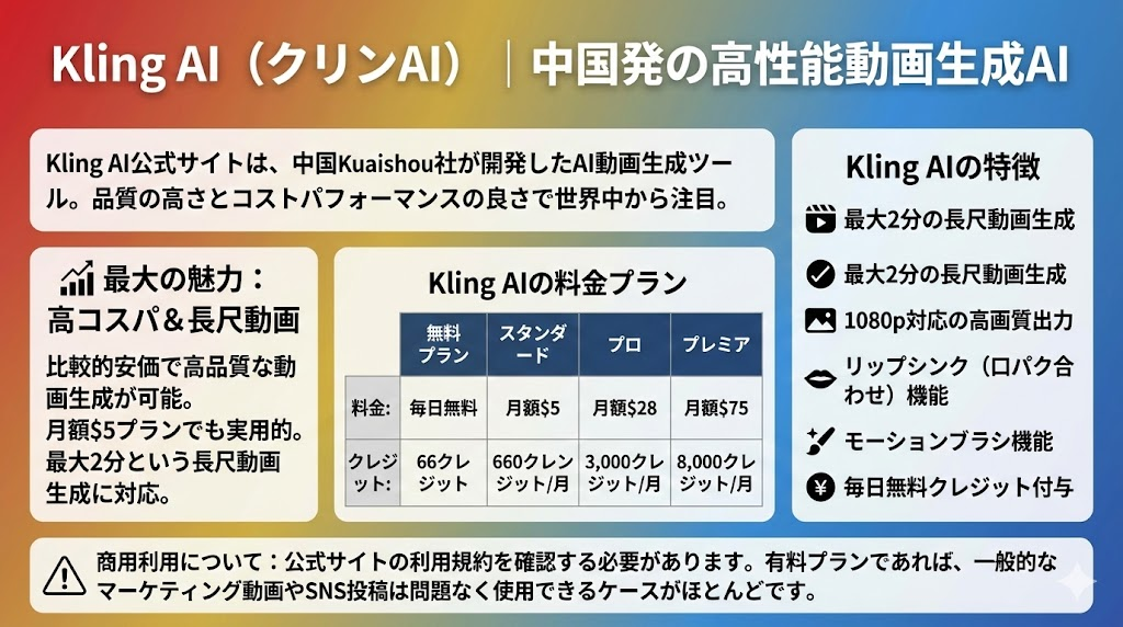 | Kling AI | 月額$5〜 | ◯ | △ | ◯ | 高品質・コスパ |
