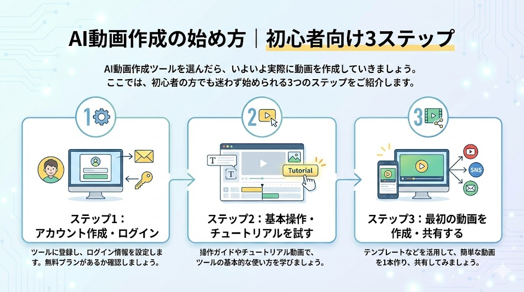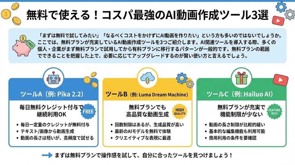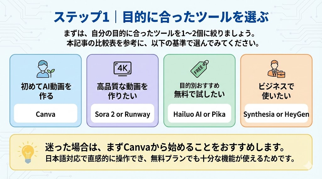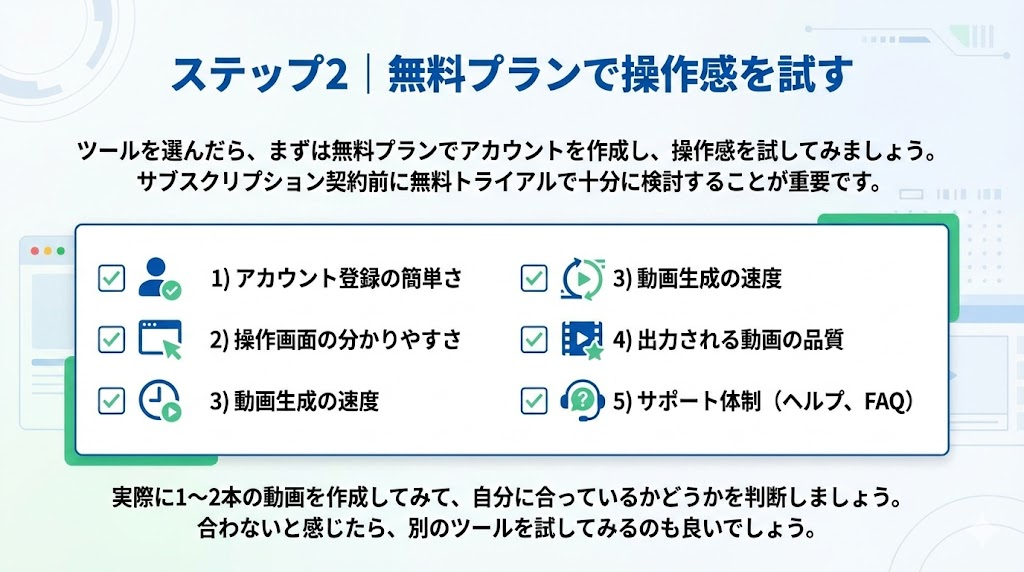 一つのツールに決め打ちせず、2〜3個のツールを実際に試して比較してみましょう。同じ内容の動画を作成してみることで、各ツールの得意分野や使いやすさが分かります。