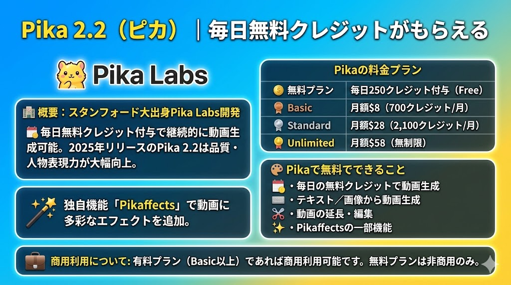 - Pika 2.2:毎日無料クレジット付与
