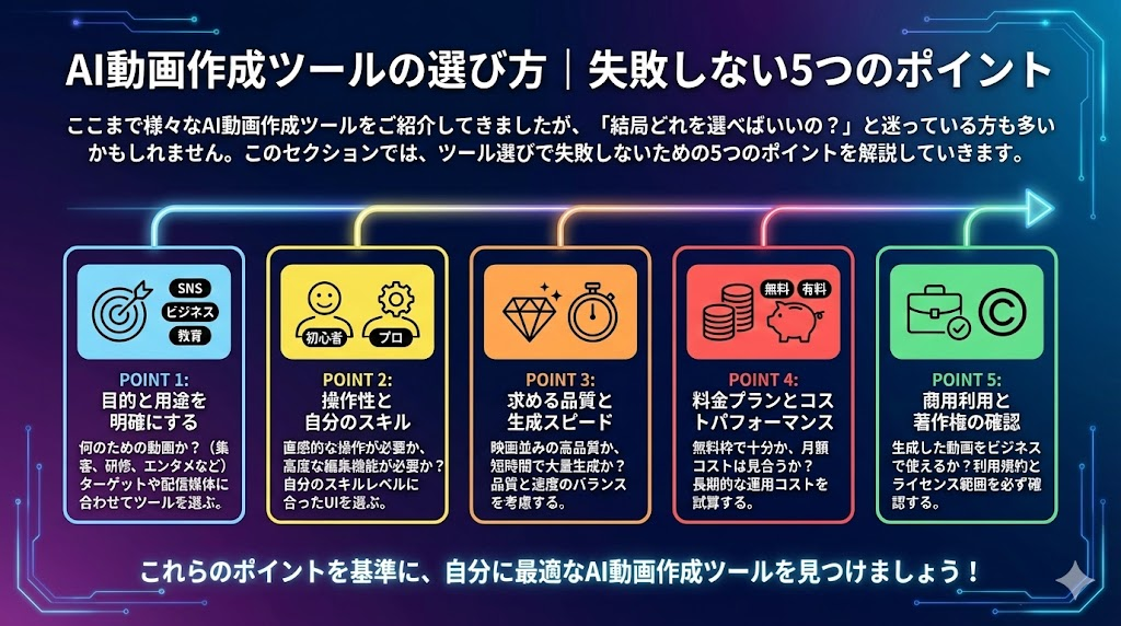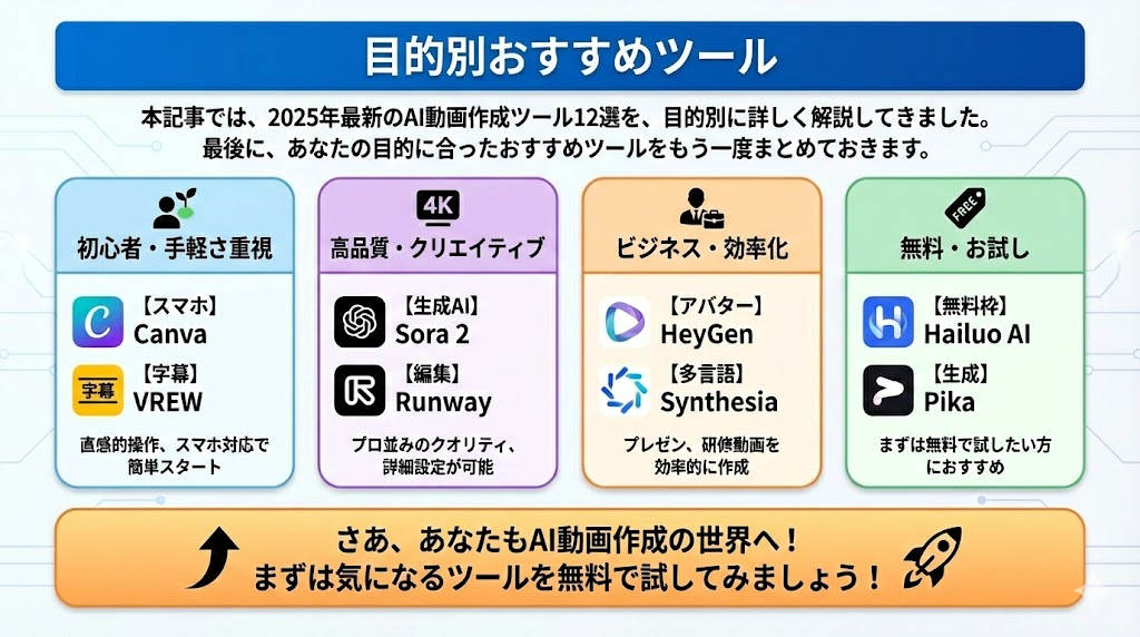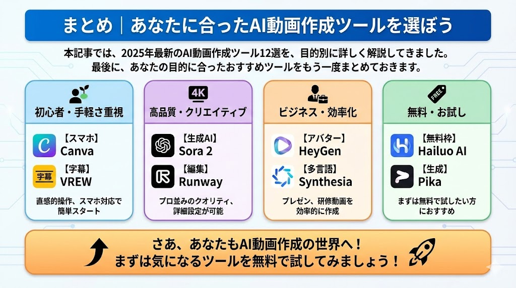 本記事では、2025年最新のAI動画作成ツール12選を、目的別に詳しく解説してきました。最後に、あなたの目的に合ったおすすめツールをもう一度まとめておきます。