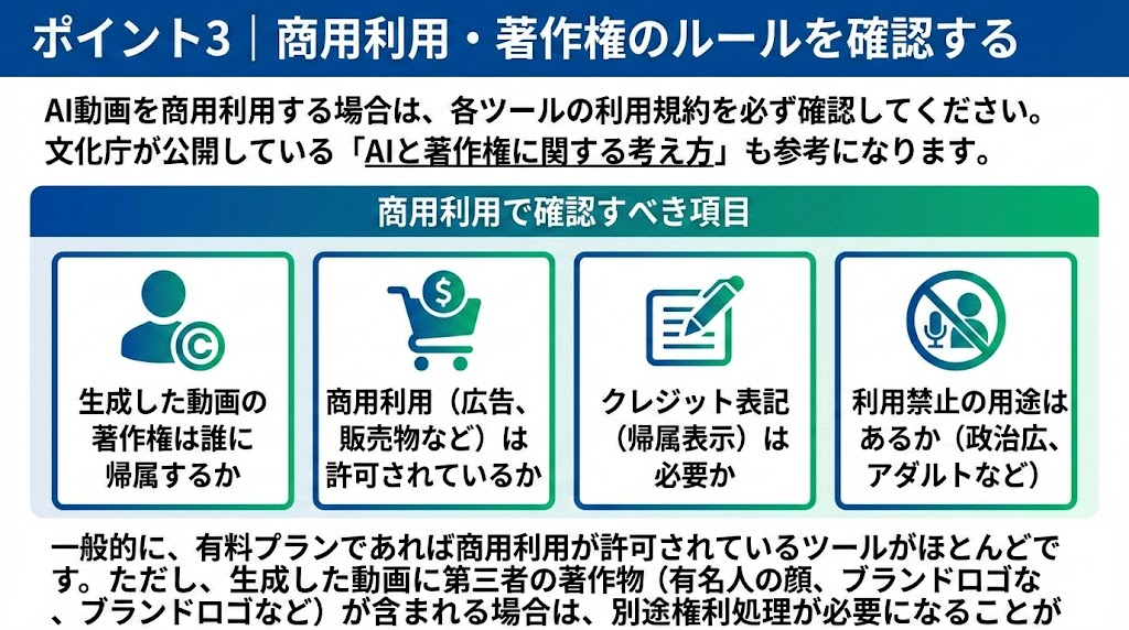 - 生成した動画の権利は誰に帰属するか(多くの場合、利用者に帰属)