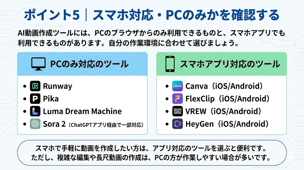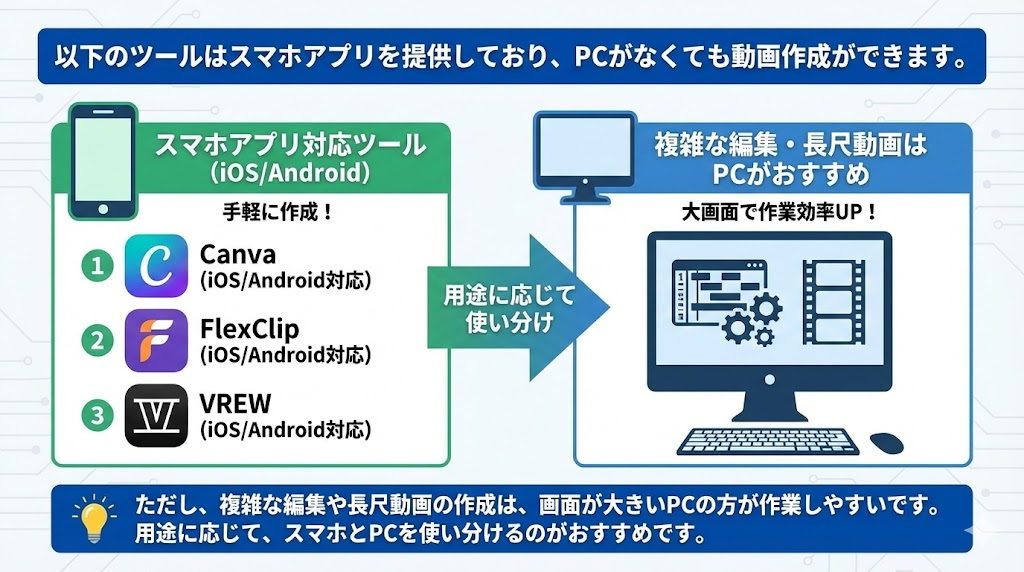 ただし、複雑な編集や長尺動画の作成は、画面が大きいPCの方が作業しやすいです。用途に応じて、スマホとPCを使い分けるのが効率的です。