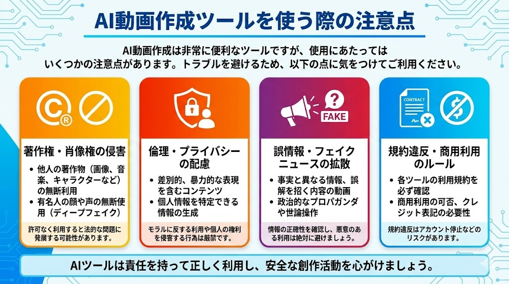 AI動画作成は非常に便利なツールですが、使用にあたっては いくつかの注意点があります。トラブルを避けるため、以下の点に気をつけてご利用ください。