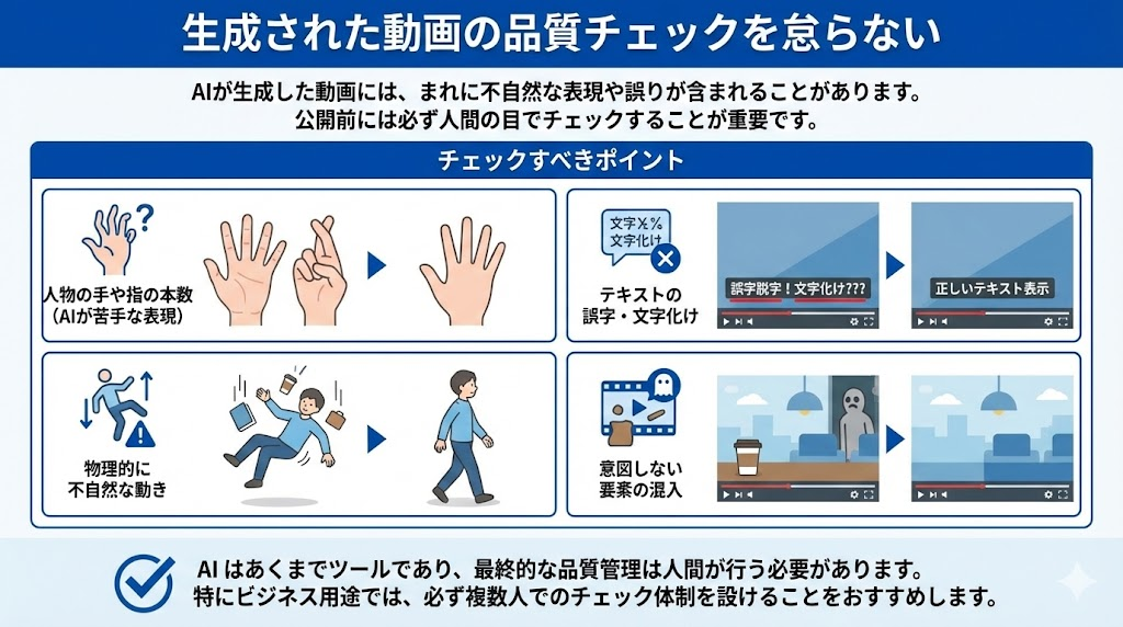 AIが生成した動画には、まれに不自然な表現や誤りが含まれることがあります。公開前には必ず人間の目でチェックすることが重要です。