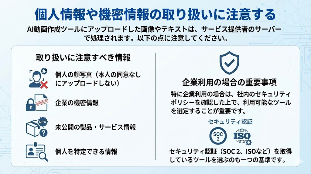 AI動画作成ツールにアップロードした画像やテキストは、サービス提供者のサーバーで処理されます。以下の点に注意してください。