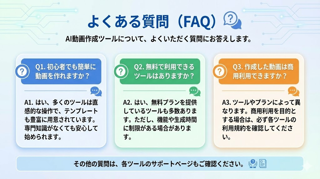 AI動画作成ツールについて、よくいただく質問にお答えします。