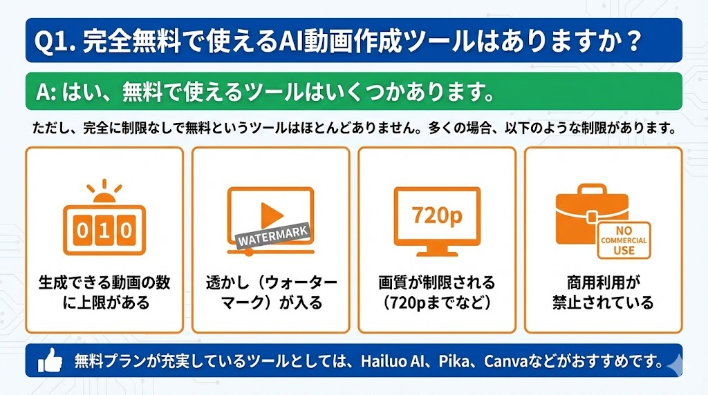 Q1. 完全無料で使えるAI動画作成ツールはありますか?