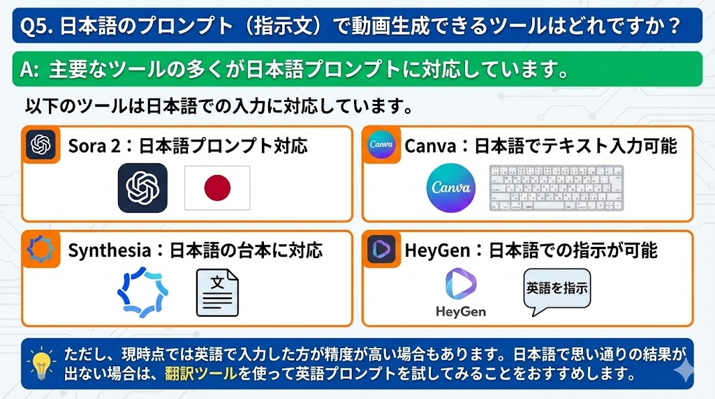 Q5. 日本語のプロンプト(指示文)で動画生成できるツールはどれですか?